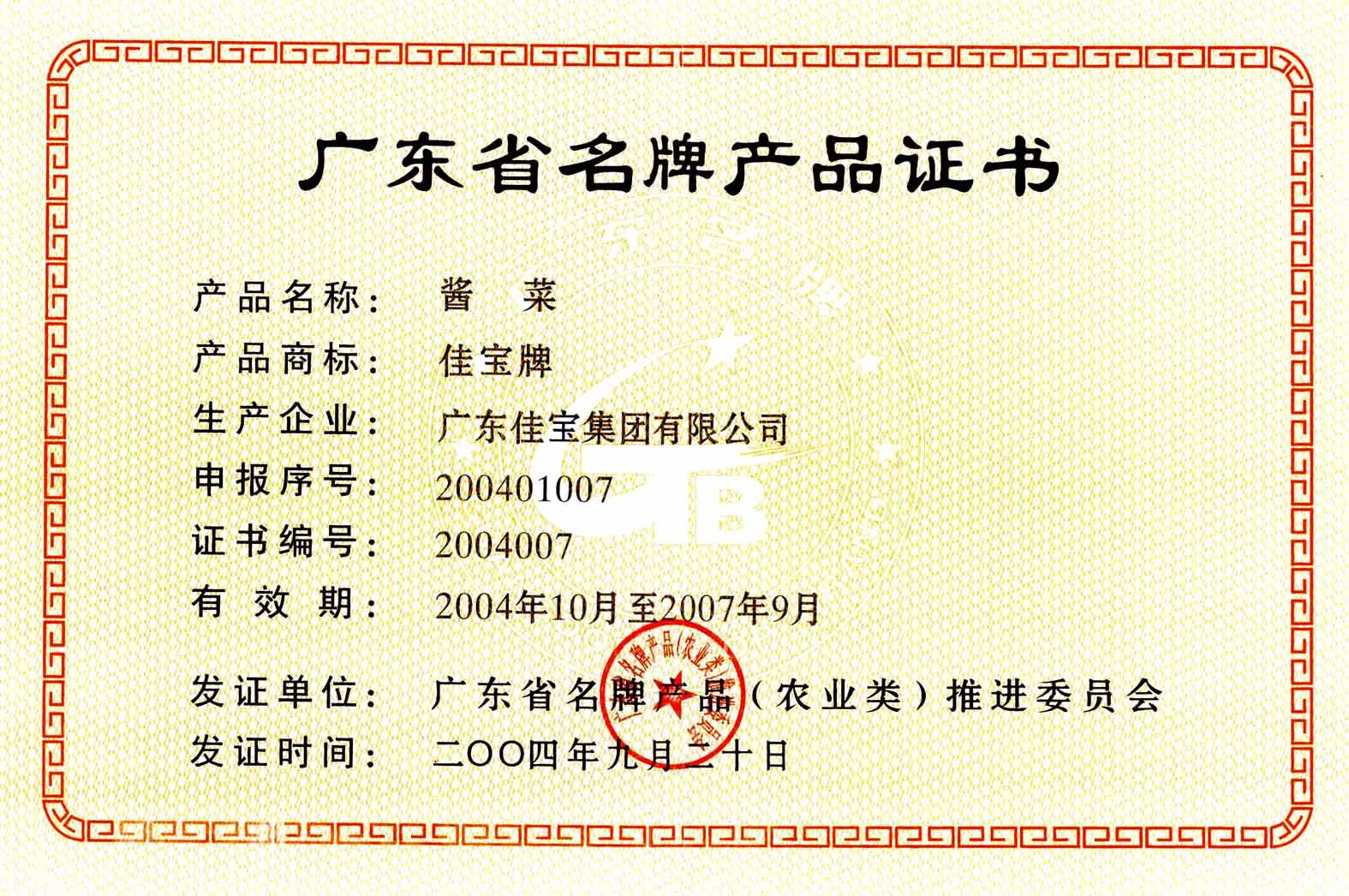 2004年 佳寶醬菜 廣東省名牌產品<農業類>推進委員會